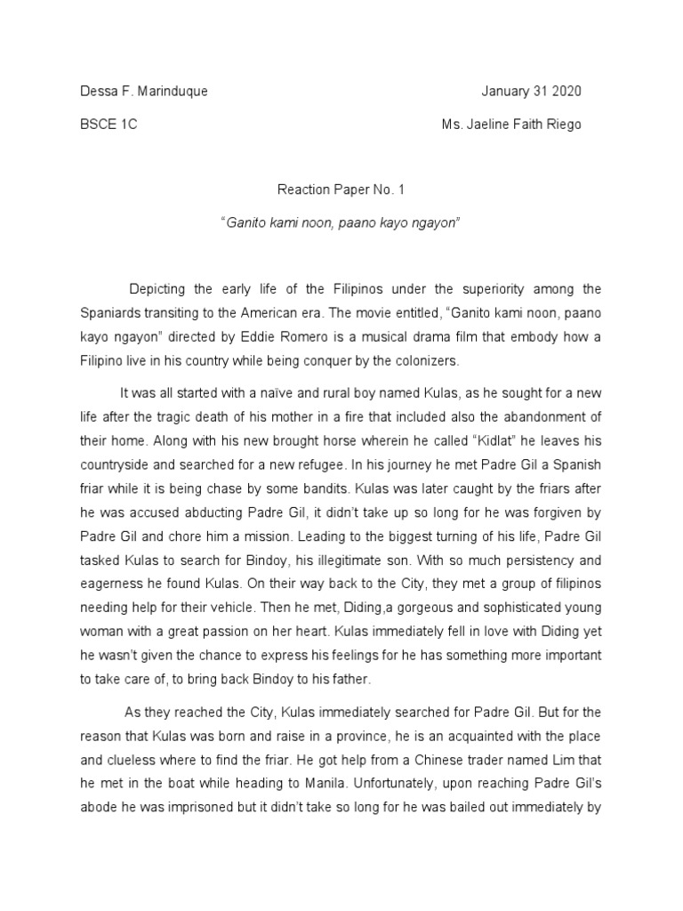 Reflection Paper Ganito Kami Noon Paano Kayo Ngayon Bumatay Gellison S P 100 Life And Works Studocu